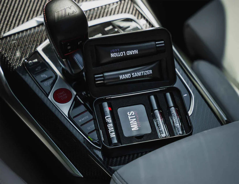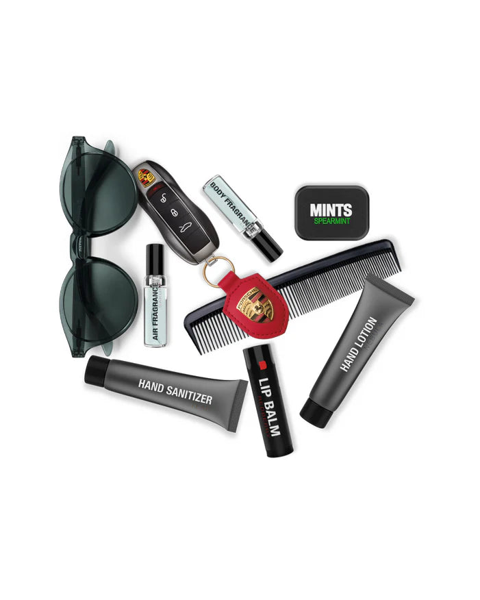 Include 6 produse: odorizant de masina, parfum pentru corp, lotiune de maini, dezinfectant pentru maini, balsam hidratant de buze si bomboane mentolate.